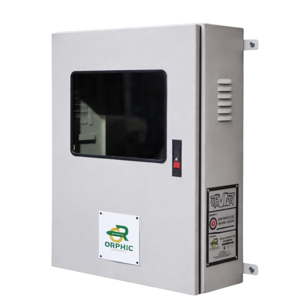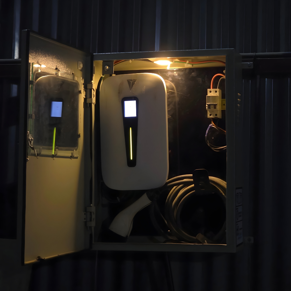 Manufactured using high quality CR2 metal sheet and finished with a long-lasting powder-coated paint, KAVACH offers excellent durability, corrosion resistance, and a clean, professional look. The see through glass panel allows easy monitoring of the charger without opening the box, while the pre-installed 32 Amp MCB ensures added electrical safety and protection.